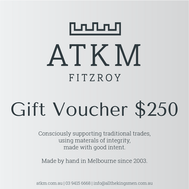 Gift an experience that goes beyond the ordinary. With the ATKM Gift Voucher, you're not just giving a present; you're sharing a legacy of quality, supporting local craftsmanship, and providing a choice of timeless products that embody the spirit of your community.